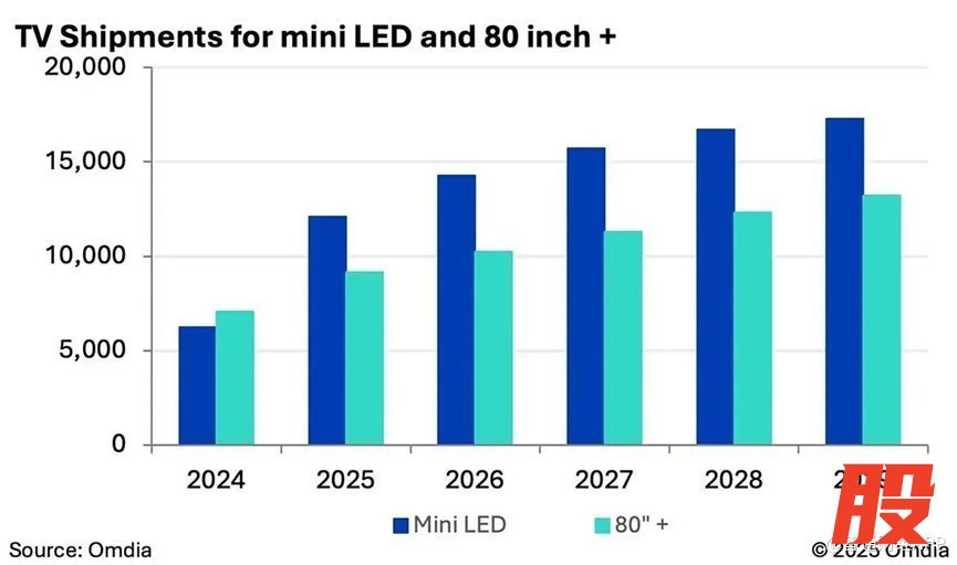 据TCL电子财报显示,2025年,全球电视出货量约2.09亿台,行业结构性升级趋势凸显,大尺寸化与高端化成为核心增长主线。其中,65寸及以上大尺寸电视出货量同比增长5.3%,Mini LED电视渗透率实现翻倍式增长,从2024年的3.1%大幅提升至6.1%。随着日韩头部品牌纷纷加码跟进,Mini LED技术路径已成为高端电视市场的主流选择,据Omdia预测,到2029年,其全球出货量占比将突破1700万台,行业增长空间广阔。
