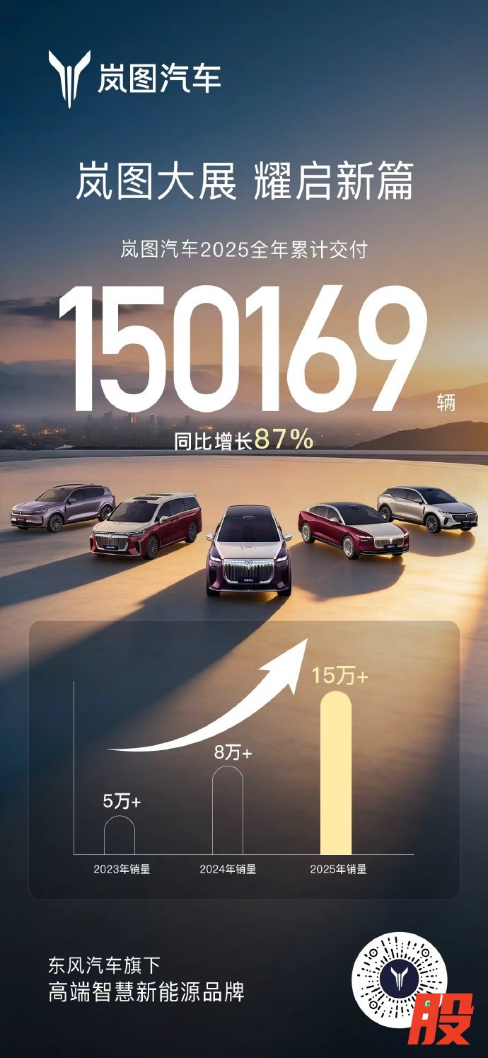 岚图汽车2025年累计交付15万辆,同比增长87%岚图汽车2025年累计交付15万辆,同比增长87%