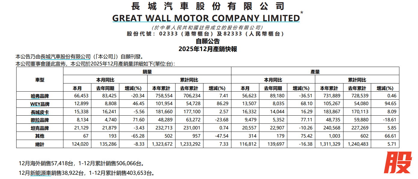长城汽车:2025年汽车销量为132.4万辆,同比增长7.33%长城汽车:2025年汽车销量为132.4万辆,同比增长7.33%